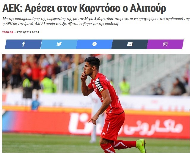 در ادامه این مطلب رسانه یونانی آمده است: علی علیپور در 3 فصل اخیر لیگ برتر ایران با تیم پرسپولیس به قهرمانی رسید و سابقه 2 بازی ملی نیز دارد. این مهاجم میتواند به همراه کاردوسو نقش مثبتی در خط حمله تیم آاِک داشته باشد. به احتمال فراوان تیم آاِک برای جذب علی علیپور تلاش خواهد کرد. هر چند او تنها بازیکن موردنظر این تیم برای خط حمله نخواهد بود.