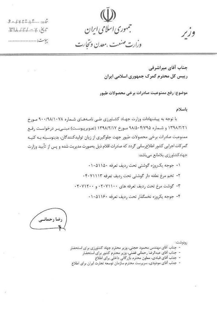 به گزارش خبرنگار اقتصادی خبرگزاری تسنیم، رحمانی وزیر صنعت در مکاتبهای با رئیس کل گمرک با اشاره به پیشنهاد وزارت جهاد کشاورزی مبنی بر درخواست رفع ممنوعیت صادرات برخی محصولات طیور جهت جلوگیری از زیان تولیدکنندگان، تاکید کرد، صادرات 4قلم کالا از جمله جوجه یک روزه گوشتی، پس از تایید وزارت جهاد کشاورزی بلامانع است.