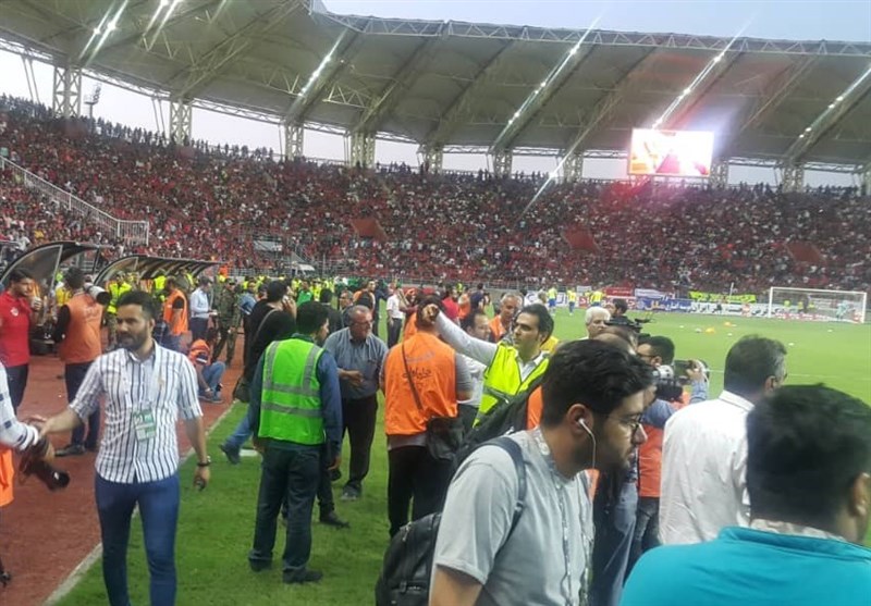 در نهایت با تصمیم مسئولان پرسپولیس، بازیکنان و اعضای کادرفنی این تیم به نشانه اعتراض ساعت 22:20 از زمین خارج و راهی رختکن شدند. این اتفاق در حالی رقم خورد که تماشاگرانی که روی سکوها قرار داشتند و به شدت از این اتفاقات عصبی شده بودند، اشیایی را به سمت زمین پرتاب کرده و حتی اقدام به شکستن صندلیها کردند. این اتفاق زمانی اوج گرفت که بازیکنان داماش در حال خروج از زمین بودند که شدت عصبانیت هواداران بیشتر شد.