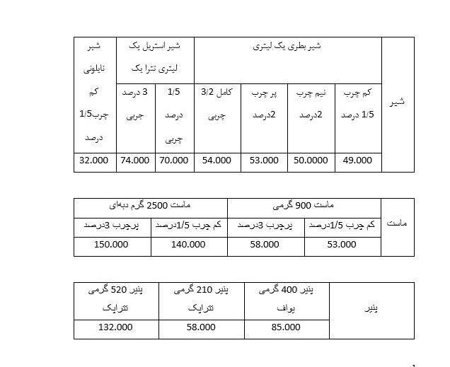 • قیمت لبنیات