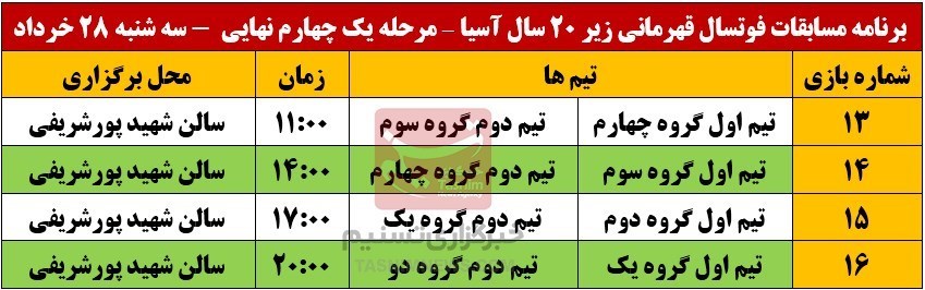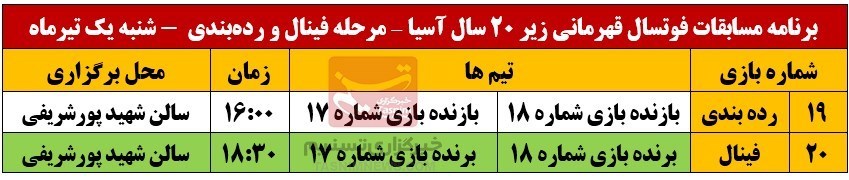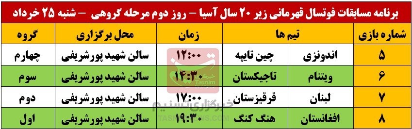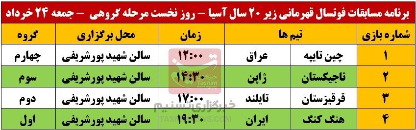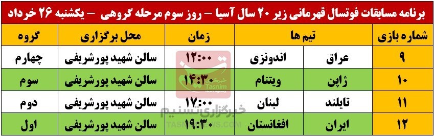 به گزارش خبرگزاری تسنیم از تبریز، مسابقات فوتسال قهرمانی زیر 20 سال آسیا با حضور 12 تیم از 24 خردادماه تا یک تیرماه در سالن شهید پورشریفی این شهر برگزار میشود.