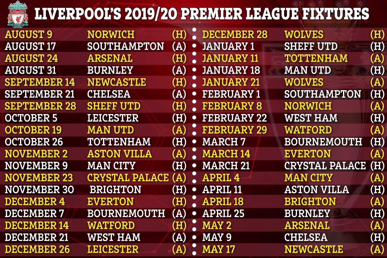 بر این اساس دیدار افتتاحیه فصل بعد لیگ برتر انگلیس مصاف خانگی لیورپول و نوریچ تازه صعود کرده در آنفیلد در تاریخ 9 آگوست (18 مرداد) خواهد بود. با این حال مهمترین بازی دو روز بعد در ورزشگاه اولدترافورد میان تیمهای منچستریونایتد و چلسی خواهد برگزار خواهد شد. در همان روز هم آرسنال میهمان نیوکاسل است.