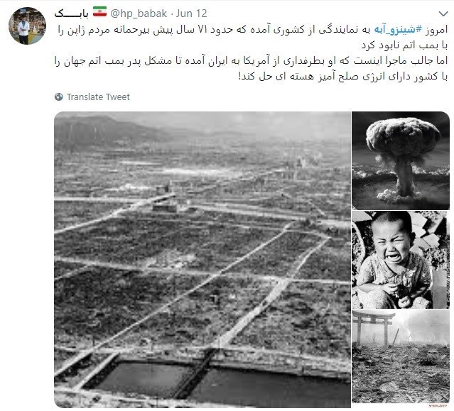 محمد وحیدی: شاید تلخ‌ترین جوک سیاسی-تاریخی قرن لقب بگیرد، وقتی تنها قربانی بمب اتم، میانجی و فرستاده تنها استفاده‌کننده از بمب اتم خواهد بود برای حل معضل اتمی کشوری که صلح‌آمیز بودن برنامه اتمی‌اش بارها تایید شده است!
