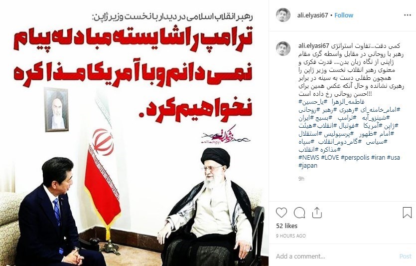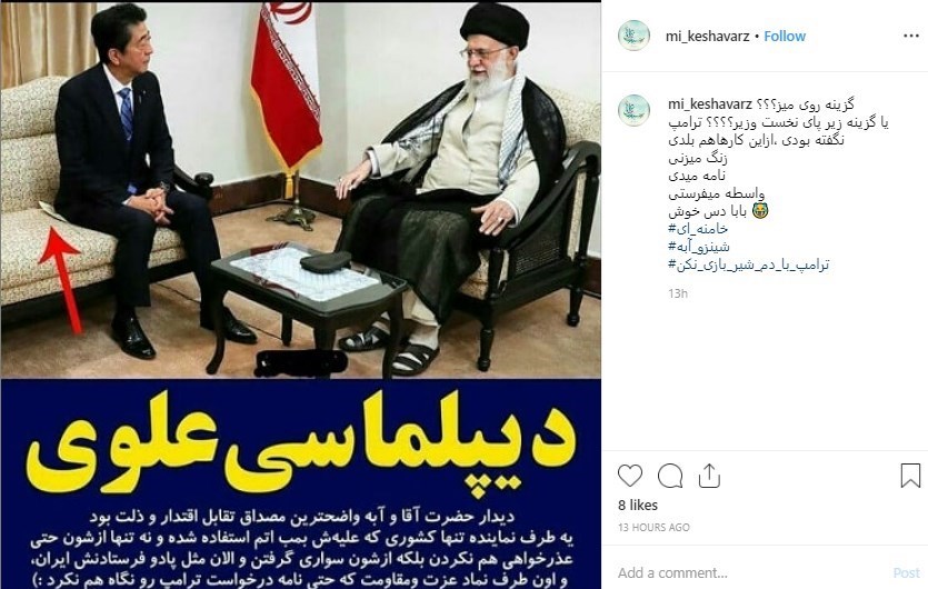 کاربر دیگری با انتشار دو تصویر متفاوت از شینزو آبه، به مقایسه رفتار نخست وزیر ژاپن در دیدار با حسن روحانی و رهبر انقلاب پرداخت.