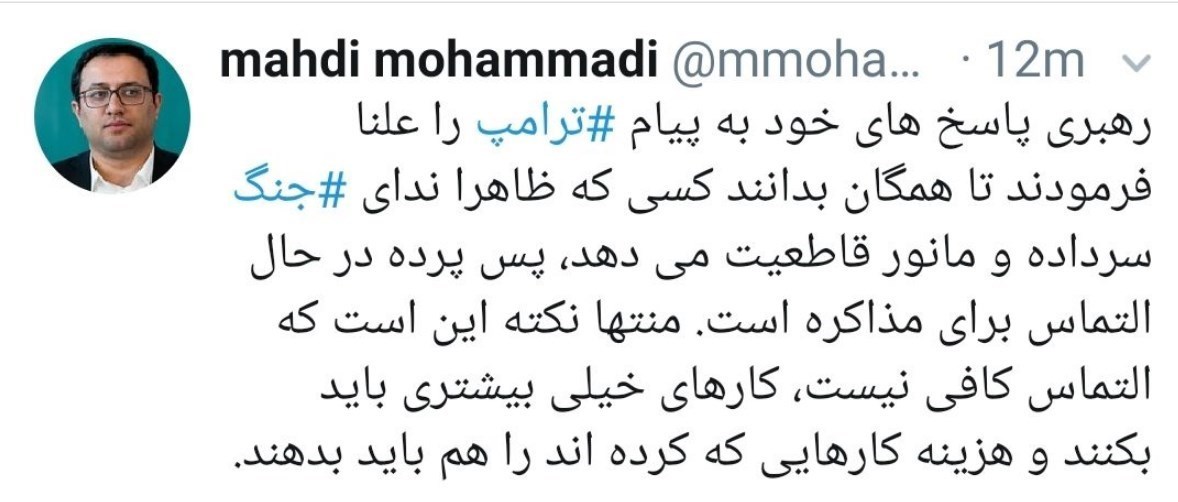 سیدوحید دلبری: فقط گذر زمان میتونه زوایای پنهان و اثرات مهم رد کردن نامه ترامپ را نشون بده خدا رو شکر، آیندگان برگ های زرین زیادی برای مرور تاریخ ایران خواهند داشت.