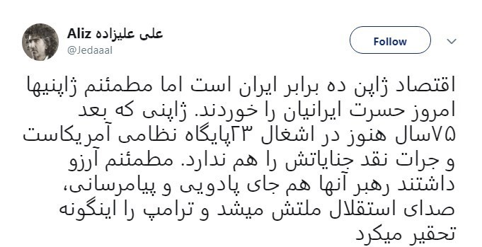 حمید باب الحوائجی: آبِ پاکی را روی دست #شینزو_آبه ریختند؛ پیامش را نپذیرفتند و بدون‌جواب راهی‌اش کردند. فکر نکنیم او یک نامه‌رسان معمولی است؛ او نخست‌وزیر سومین اقتصاد جهان است که کمتر از پانزده روز دیگر میزبان 20 قدرت اقتصادی جهان خواهد بود. ما کی هستیم؟