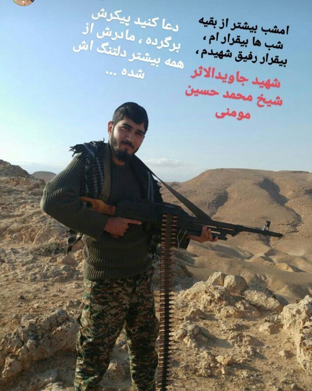 در گروه دوستان پیامی دیدم که نوشته « محمد حسین مومنی آسمانی شد»، شهادت دیگران برایم سخت بود و گاهی برایشان اشک می‌ریختم ولی برای محمد حسین نه. می‌دانستم که روزی شهید می‌شود اصلا برای زمینی بودن خلق نشده بود. می‌گفتند تکفیری‌هایی که او را به شهادت رسانده‌اند پس از مشاهده تصویر معمم او در چند سایت داخلی! با تصور اینکه یکی از فرماندهان ارشد را به شهادت رسانده‌اند بدن مطهرش را همراه خود برده‌اند.