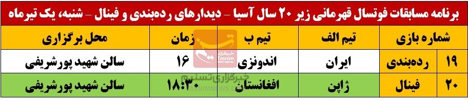 به گزارش تسنیم، دومین دوره مسابقات فوتسال قهرمانی زیر 20 سال آسیا با حضور 12 تیم از 24 خردادماه بهمیزبانی تبریز آغاز شده و روز شنبه، یک تیرماه با برگزاری دیدارهای ردهبندی و فینال به پایان میرسد.