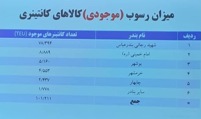 همچنین در حال حاضر حدود 9 هزار کانتینر در بندر امام خمینی، 5 هزار کانتینر در بندر بوشهر، 4.5 هزار در بندر خرمشهر و 2.4 هزار کانتینر در بندر چابهار دپو شده است.