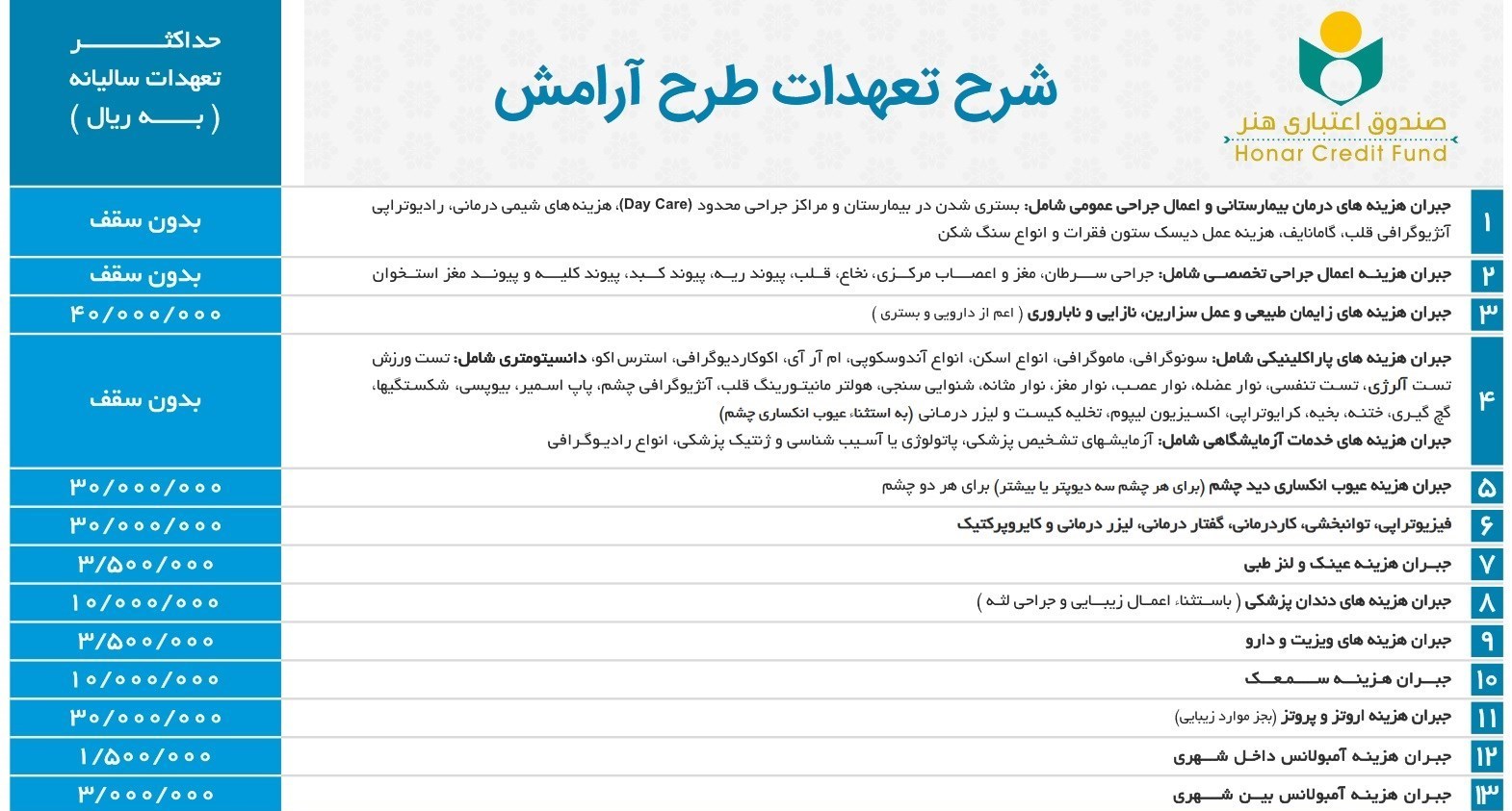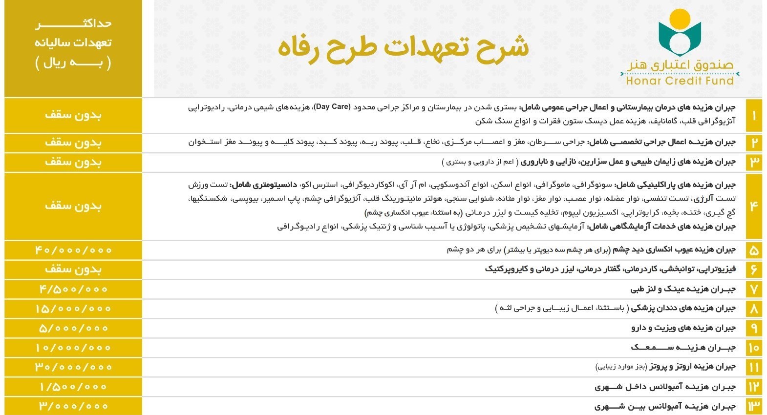 اعضای صندوق اعتباری هنر با پرداخت بخشی از حق بیمه کل، مشمول بهرهمندی از خدمات بیمه درمان تکمیلی میشوند و مابقی هزینه بر عهده صندوق است.