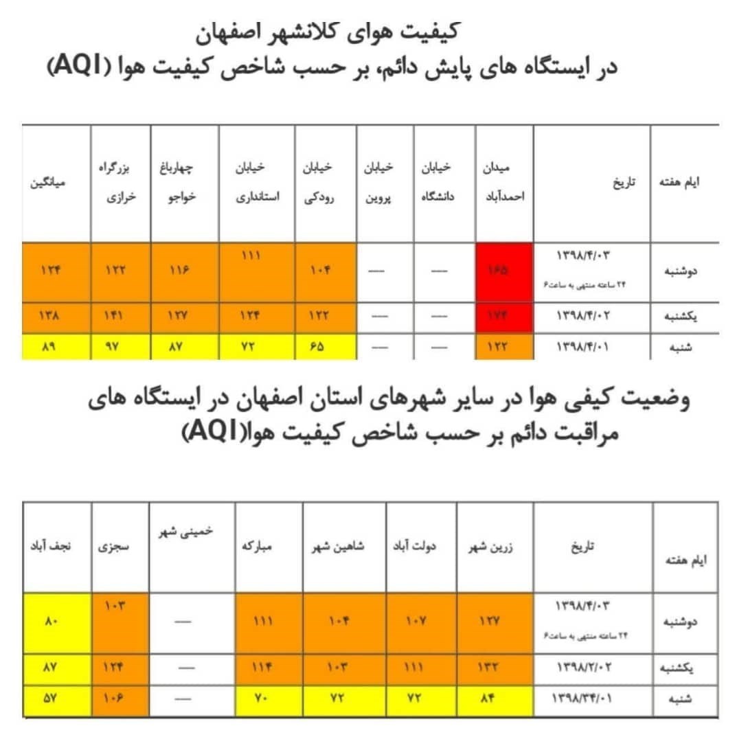 بر این اساس شاخص کیفی هوا در ایستگاههای میدان احمدآباد 165، خیابان رودکی 104، خیابان استانداری 111، چهارباغ خواجو 116، و بزرگراه خرازی 122 گزارش شده است.