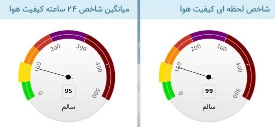 از طرف دیگر بر اساس اطلاعات مرکز پایش و کنترل کیفیت هوای شهرداری اصفهان، میانگین شاخص 24 ساعته کیفیت هوا عدد 95 و شاخص لحظهای نیز عدد 99 را نشان میدهد که هر دو نشانگر وضعیت سالم است.