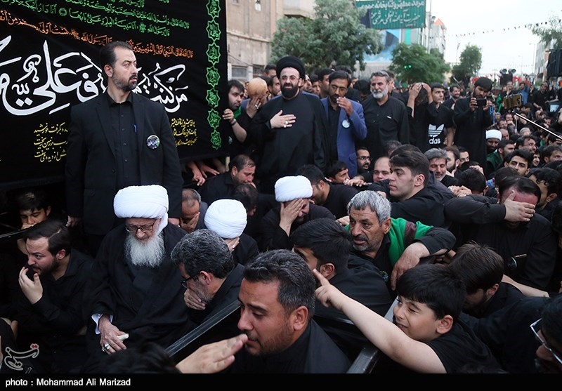 دسته عزاداری شهادت امام صادق (ع) با حضور آیتالله وحید خراسانی مرجع تقلید شیعیان،طلاب و روحانیون و سوگواران شهادت این امام همام از دفتر معظمله تا حرم حضرت معصومه (س) برپا شد.