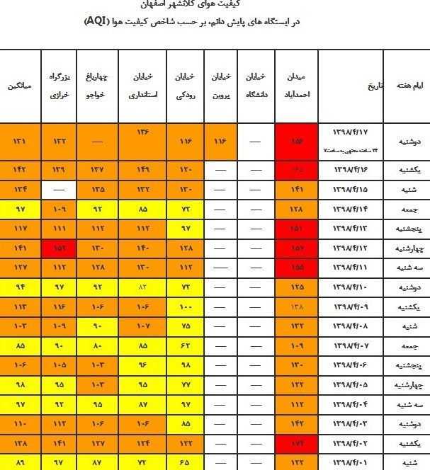 براساس اعلام این مرکز میانگین شاخص کیفی هوا در ایستگاههای میدان احمد آباد اصفهان 156، خیابان پروین 116، خیابان رودکی 116، خیابان استانداری 136، بزرگراه خرازی 132 ثبت شده است.
