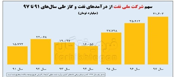 بر اساس قوانین بودجه‌ای کشور، سالانه 14.5 درصد از درآمد حاصل از فروش داخلی و صادرات نفت و گاز کشور به شرکت ملی نفت ایران اختصاص پیدا می‌کند. در این زمینه بررسی گزارش تفریغ بودجه سالانه کشور نشان می‌دهد سهم شرکت ملی نفت از درآمدهای فروش نفت و گاز از 15.7 هزار میلیارد تومان در سال 91 به 22 هزار میلیارد تومان در سال 92، به 19 هزار میلیارد تومان در سال 93، به 16 هزار میلیارد تومان در سال 94، به 27.7 هزار میلیارد تومان در سال 95 و به حدود 36 هزار میلیارد تومان در سال 96 رسیده است. همچنین برآوردها نشان می‌دهد سهم شرکت ملی نفت از فروش داخلی و صادرات نفت و گاز در سال 1397 نیز به حدود 41.4 هزار میلیارد تومان خواهد رسید که این میزان حدود 1.5 برابر رقم سهم شرکت از فروش نفت در سال 95 و حدود 2.5 برابر سهم شرکت از فروش نفت در سال 94 است. همچنین سهم شرکت ملی نفت در سال 91 بیش از 6 هزار میلیارد تومان از سهم این شرکت در سال 93 بیشتر است. به عبارت دیگر شرکت ملی نفت به واسطه آنکه بخش قابل‌توجهی از درآمد یا سهم سالانه خود از فروش نفت را به تامین هزینه‌های جاری اختصاص می‌دهد، از این منظر، هم با بودجه 16 هزار میلیارد تومانی و هم با بودجه 41 هزار میلیارد تومانی می‌تواند مجموعه را اداره کند. همین یک نکته نشان می‌دهد چه مقدار جای شفافیت در عملکرد شرکت ملی نفت خالی است.