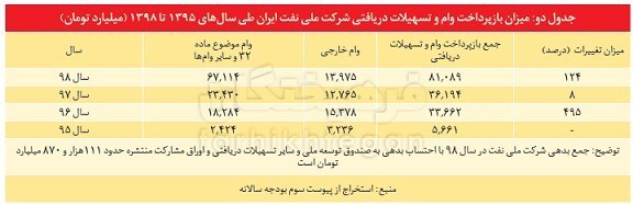 بررسی پیوست سوم بودجه سالانه کشور نشان می‌دهد بدهی یا مجموع بازپرداخت وام و تسهیلات دریافتی شرکت ملی نفت به بانک‌های داخلی و بدهی‌های ناشی از وام خارجی این شرکت از 5.6هزار میلیارد تومان در سال 95 به 33.6 هزار میلیارد تومان در سال 96، به 36.1 هزار میلیارد تومان در سال 97 و به 81 هزار میلیارد تومان در سال 97 رسیده است. اما سیدمحمد حسینی، عضو ناظر مجلس در صندوق توسعه ملی در این باره می‌گوید آنچه به‌عنوان بدهی در بودجه سال 98 شرکت ملی نفت آمده فقط مربوط به وام بانکی و وام‌های خارجی است و باید به این مقدار، رقم 30 هزار و 781 میلیارد تومان بدهی به صندوق توسعه ملی و سایر تسهیلات دریافتی و اوراق مشارکت منتشره را نیز افزود که در آن صورت کل بدهی سال 98 شرکت ملی نفت به 111 هزار و 870 میلیارد تومانی می‌رسد.