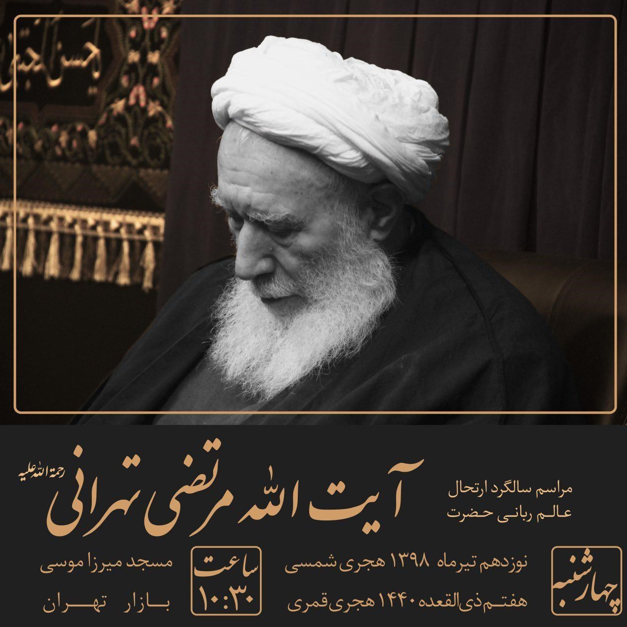 به گزارش خبرنگار فرهنگی باشگاه خبرنگاران پویا، مراسم سالگرد ارتحال آیت‌الله مرتضی تهرانی برادر مرحوم آیت‌الله آقا مجتبی تهرانی روز چهارشنبه نوزدهم تیر از ️ساعت 10:30 صبح در مسجد میرزا موسی واقع در خیابان 15 خرداد، بازار شیرازی، نرسیده به چهارسوق بزرگ ویژه آقایان برگزار می‌شود.