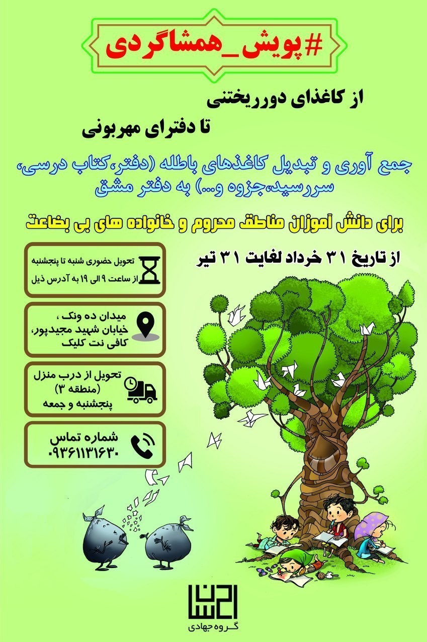 حامد وحدتی‌فر، مسئول گروه جهادی احسان، در گفت‌وگو با خبرنگار فرهنگی خبرگزاری تسنیم، با اشاره به برگزاری پویش هم‌شاگردی گفت: طی فراخوانی که در سطح شهر زده شد، دفترها و کاغذهای باطله جمع‌آوری از اوایل  خردادماه تا 31 تیرماه جمع آوری شد. البته به علت استقبال فراوان مردم از این طرح ، فراخوان شش روز تمدید شد و جمع آوری کاغذهای باطله تا 6 مردادماه ادامه داشت. ما با جمع‌آوری کاغدهای باطله و تبدیل آن‌ها به دفتر مشق و لوازم‌التحریر برای دانش‌آموزان بی‌بضاعت به این قشر از مردم کمک خواهیم کرد.