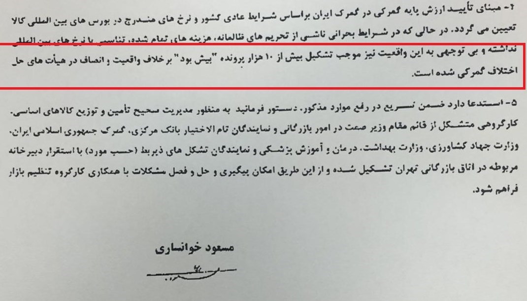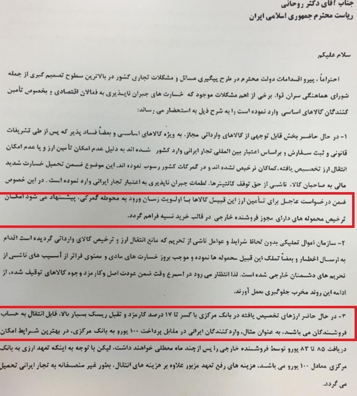 در این مکاتبه آمده است، پیرو اقدامات دولت در طرح پیگیری مسائل و مشکلات تجاری کشور در بالاترین سطوح تصمیمگیری شورای هماهنگی سران قوا برخی از رقم مشکلات موجود به خسارتهای جبرانناپذیری به فعالان اقتصادی و بخصوص در مورد کالاهای اساسی وارد نموده را به شرح زیر به استحضار میرساند: