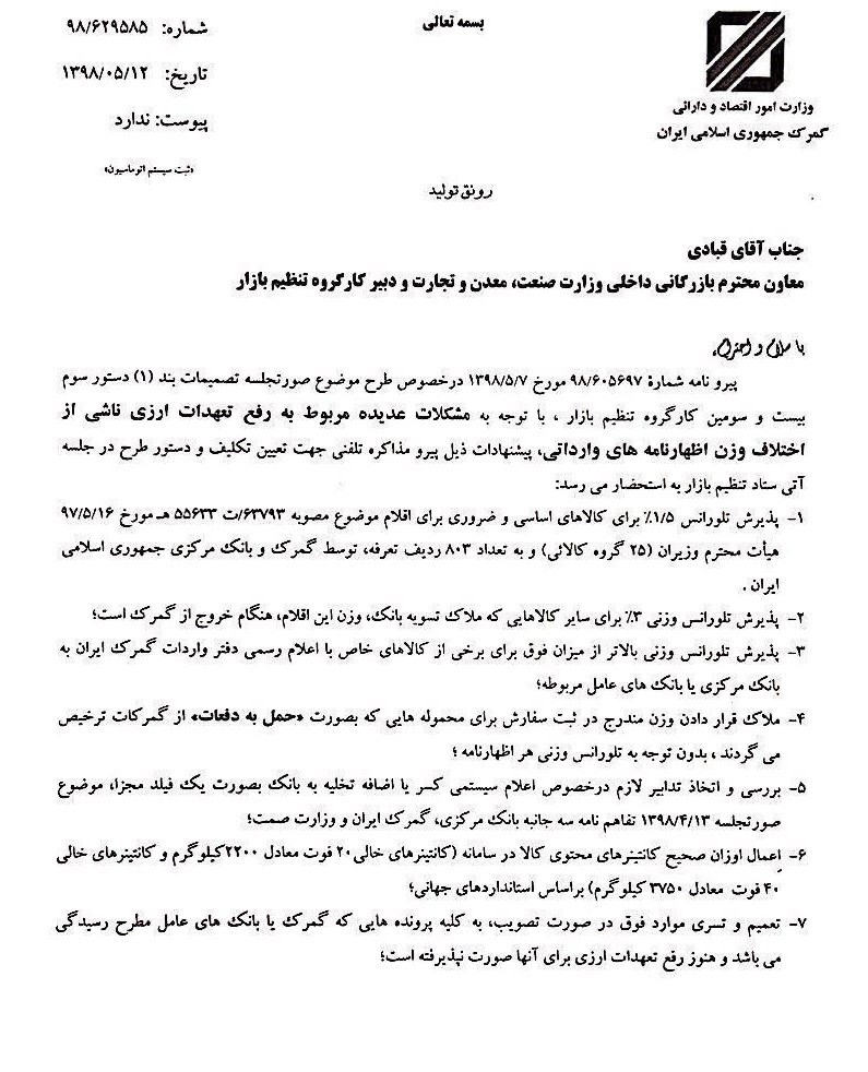 معاون فنی گمرک در مکاتبه‌ای با دبیر ستاد تنظیم بازار پیشنهاداتی را برای کاهش پرونده‌های اختلافی در گمرک و در جهت رفع تعهدات ارزی مطرح کرد.