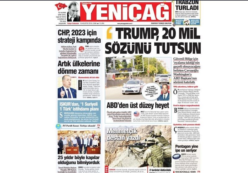 به گزارش گروه بینالملل خبرگزاری تسنیم، بسیاری از روزنامههای ترکیه، امروز در عکس و تیتر صفحه نخست، موضوع اختلاف نظر آنکارا و واشنگتن در مورد عمق منطقه امن در شمال سوریه را برجسته کردهاند.