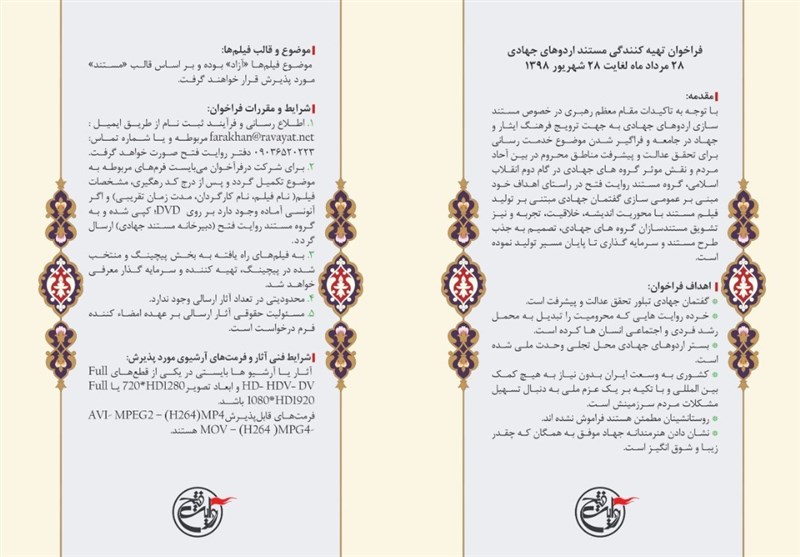 2- برای شرکت درفرآخوان میبایست فرمهای مربوطه به موضوع تکمیل گردد و پس از درج کد رهگیری، مشخصات فیلم (نام فیلم، نام کارگردان، مدت زمان تقریبی) و اگر آنونسی آماده وجود دارد بر روی DVD؛ کپی شده و به گروه مستند روایت فتح (دبیرخانه مستند جهادی) ارسال گردد.