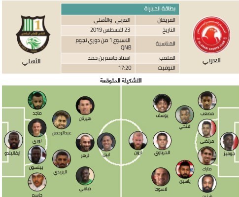 به گزارش خبرگزاری تسنیم، تیم فوتبال العربی دوحه امشب (جمعه) در بازی هفته نخست فصل 2020 - 2019 لیگ ستارگان قطر به مصاف تیم الاهلی میرود.