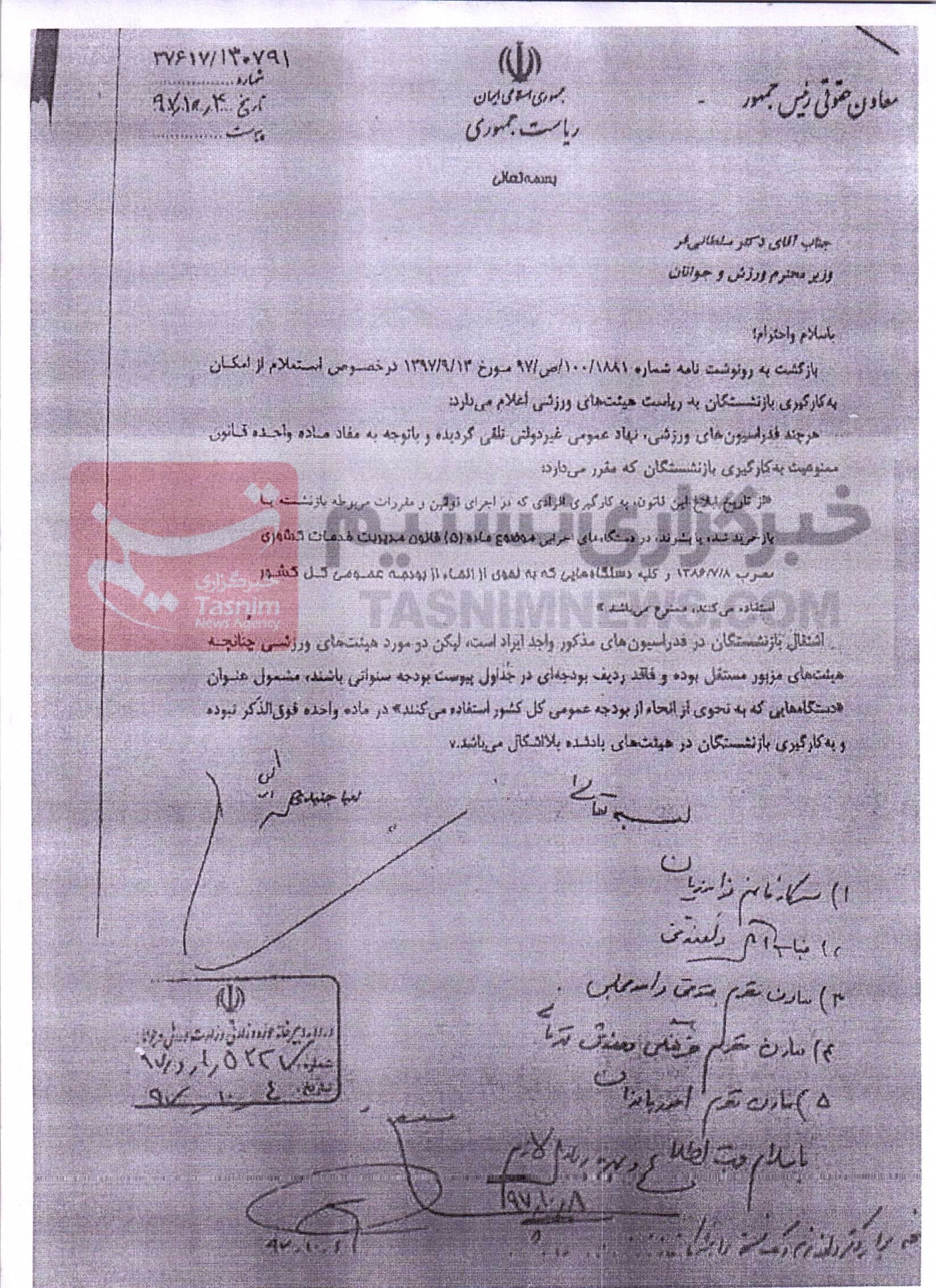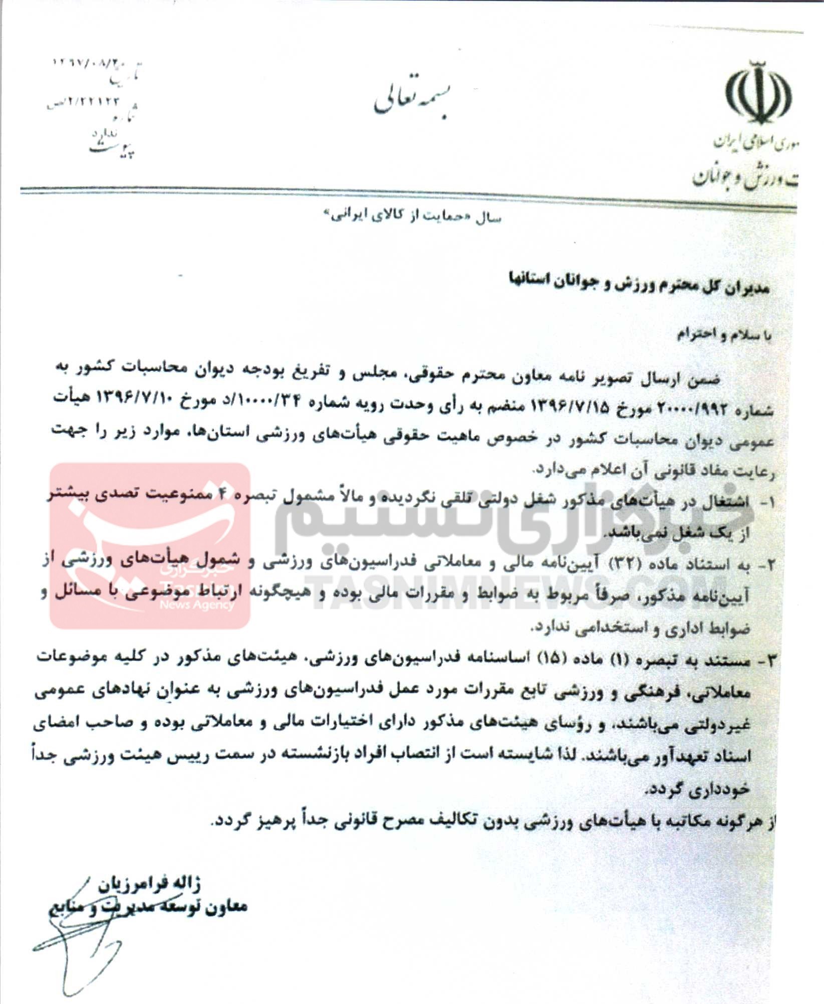 یکی از نامه‌ها در تاریخ 20 آبان 97 توسط ژاله فرامرزیان معاون توسعه مدیریت و منابع وزارت ورزش به مدیران کل استان‌ها ارسال و در آن به صراحت اعلام شده «اشتغال در هیئت‌های مذکور شعل دولتی محسوب تلفی نمی‌گردد و مشمول تبصره 4 ممنوعیت تصدی بیشتر از یک شغل نمی‌باشد».