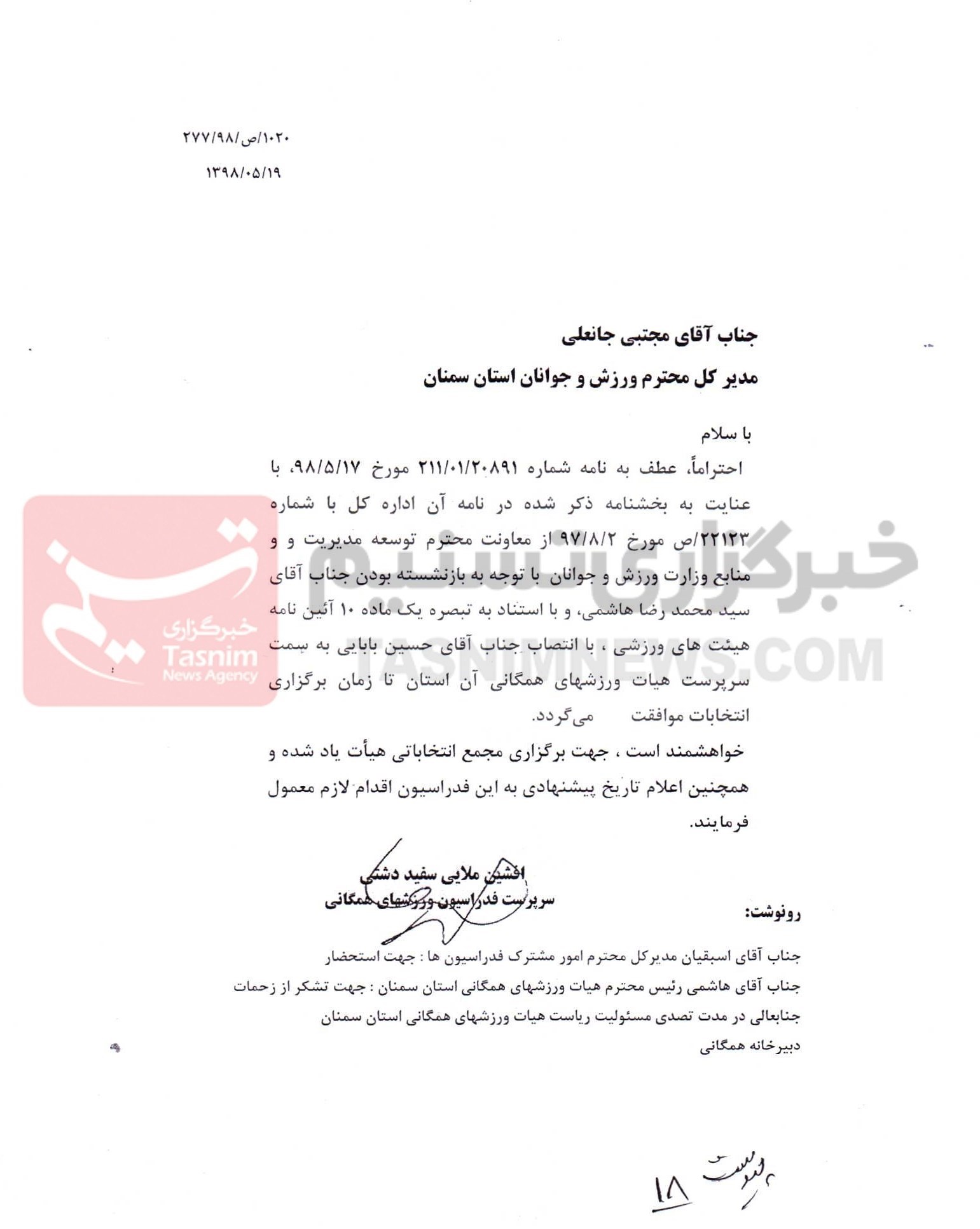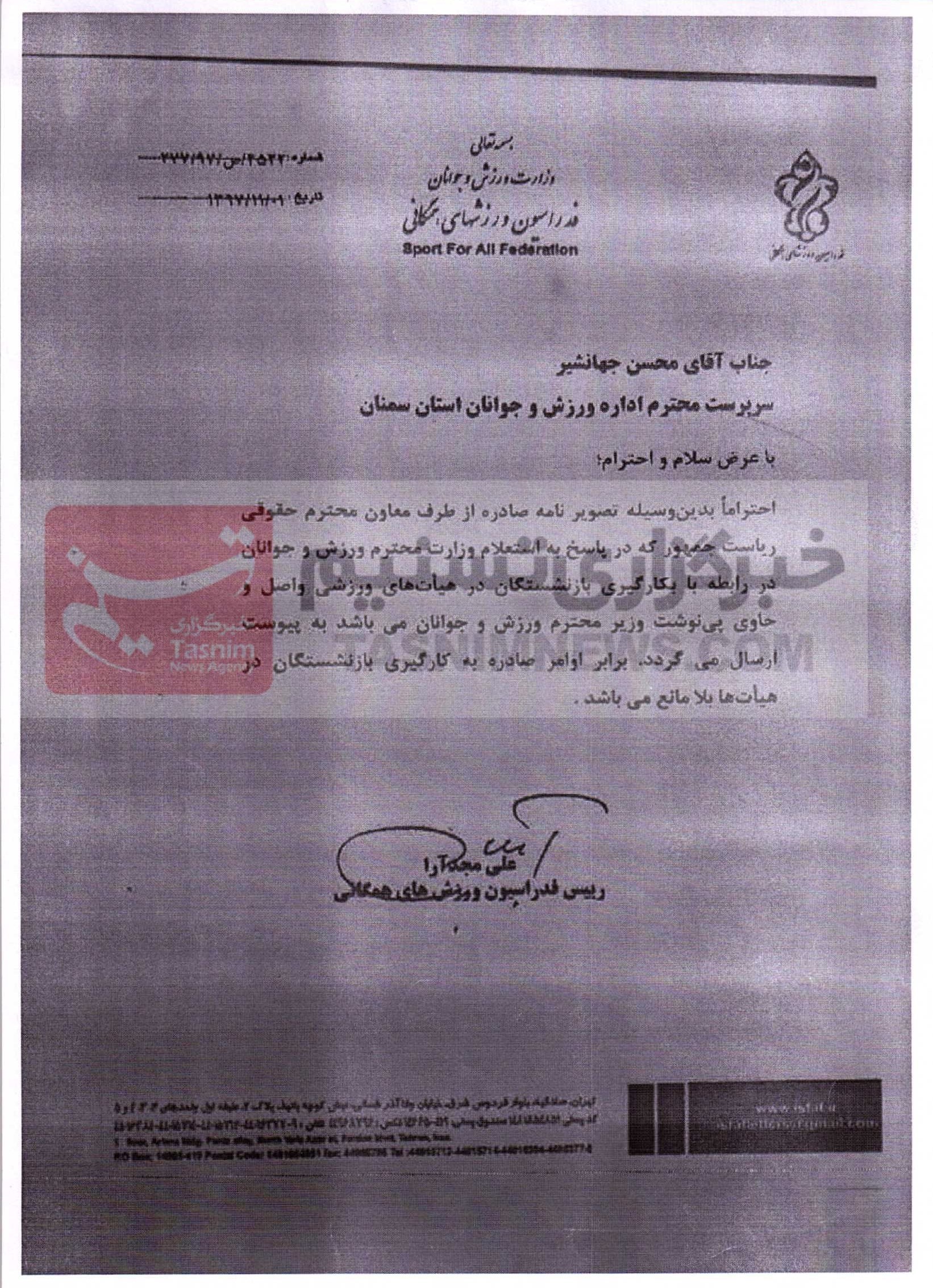 همین نامه یک ماه بعد توسط علی‌ مجدآرا رئیس وقت فدراسیون ورزش‌های همگانی به محسن جهانشیر سرپرست اداره کل ورزش و جوانان سمنان ارسال  و رسماً اعلام شده که به کارگیری بازنشستگان در هیئت‌ها بلامانع است.