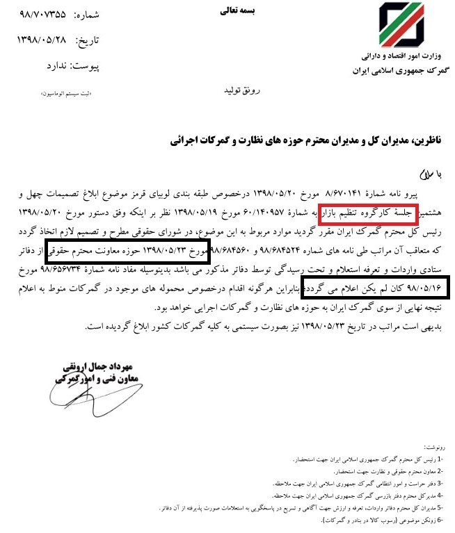 بر این اساس نامه مورخ 16 مرداد ماه کان لم یکن اعلام میگردد بنابراین هرگونه اقدام درباره محموله‌ های موجود در گمرک منوط به اعلام نتیجه از سوی گمرک ایران خواهد بود.