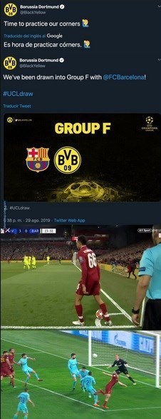 در پیامی که دورتموندیها در صفحه رسمیشان در توئیتر برای اعلام خبر همگروهی با بارسلونا منتشر کردهاند، تصاویر قرار گرفته است که احتمالاً به مذاق هیچ یک از بازیکنان بارسلونا خوش نیامده است. در این پیامی تصاویری از صحنه گل غافلگیر کننده لیورپول به بارسلونا در شب پیروزی 4 بر صفرش مقابل کاتالانها در بازی خانگی دور برگشت مرحله نیمه نهایی فصل گذشته لیگ قهرمانان اروپا قرار گرفته و در شرح آن آمده است: از الان به بعد باید روی ضربات کرنرمان کار کنیم.