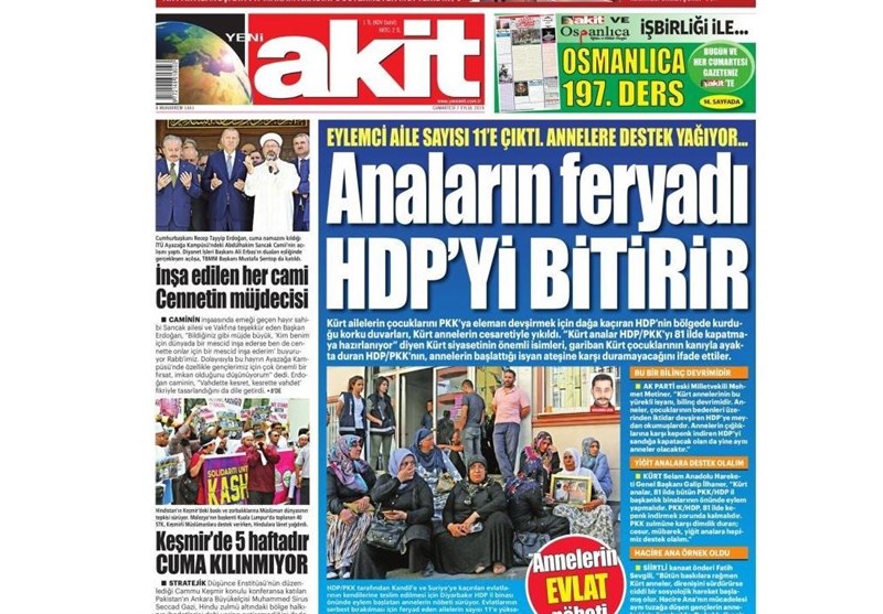 به گزارش گروه بین‌الملل خبرگزاری تسنیم، بسیاری از روزنامه‌های ترکیه، امروز در عکس و تیتر صفحه نخست، تحصن مادران کُرد علیه پ.ک.ک و همچنین صدور حکم حبس برای یکی از سیاست‌مداران مخالف اردوغان را برجسته کرده‌اند.