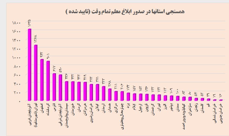 هم‌اکنون آمار تفکیکی استان‌ها در بحث صدور احکام معلم تمام وقت که از سوی آموزش‌وپرورش منتشر شده است، نشان می‌دهد که تاکنون تعداد ابلاغ‌های صادر شده 12623 نفر و ابلاغ‌های تایید شده 11231 نفر است.