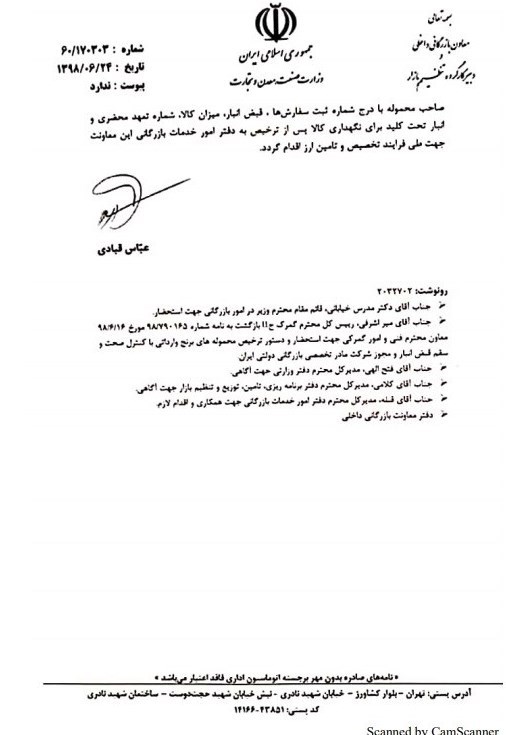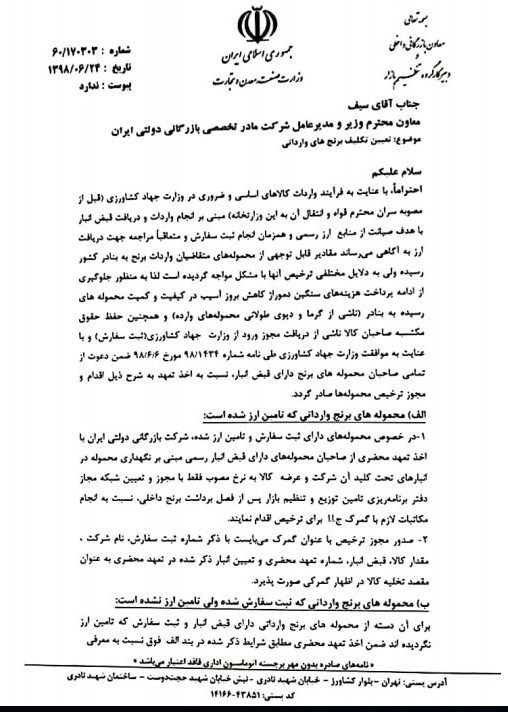"با عنایت به فرآیند واردات کالاهای اساسی و ضروری در وزارت جهاد کشاورزی (قبل از مصوبه سران قوا و انتقال آن به این وزارتخانه) مبنی بر انجام واردات و دریافت قبض انبار با هدف صیانت از منابع عرضه رسمی و هم‌زمان انجام ثبت سفارش و متعاقباً مراجعه جهت دریافت ارز به آگاهی می‌رساند، مقادیر قابل توجهی از محموله‌های متقاضیان واردات برنج به بنادر کشور رسیده ولی به‌دلایل مختلفی ترخیص آنها با مشکل مواجه گردیده است لذا برای جلوگیری از ادامه پرداخت هزینه‌های سنگین دموراژ، کاهش بروز آسیب در کیفیت و کمیت محموله‌های رسیده به بنادر (ناشی از گرما و دپوی طولانی محموله‌های وارده) و همچنین حفظ حقوق مکتسبه صاحبان کالا ناشی از دریافت مجوز ورود از وزارت جهاد کشاورزی (ثبت سفارش) و با عنایت به موافقت وزارت جهاد کشاورزی طی نامه شماره 1434/98 مورخ 6 شهریور 98 ضمن دعوت از تمامی صاحبان محموله‌های برنج دارای قبض انبار نسبت به اخذ تعهد به‌شرح ذیل اقدام و مجوز ترخیص محموله‌ها صادر گردد؛