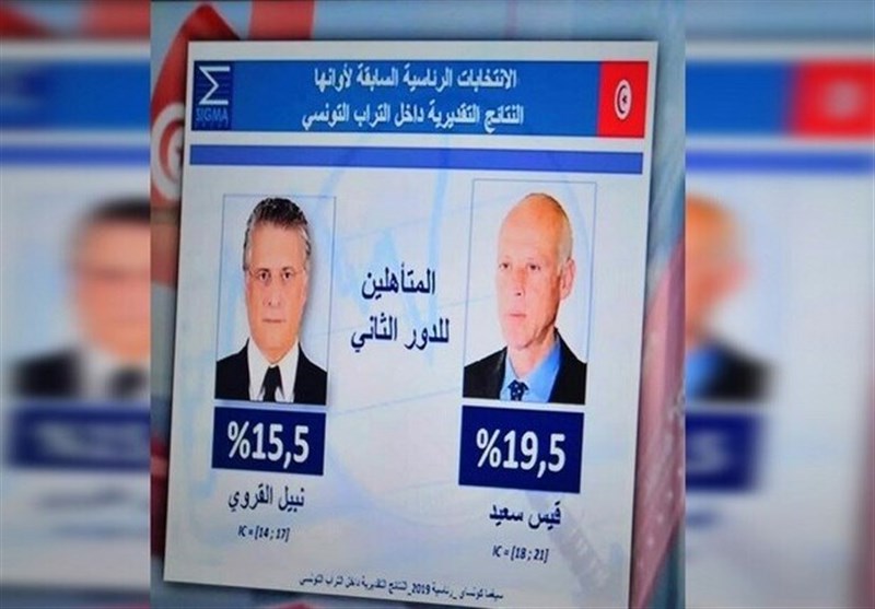 به گزارش گروه بین الملل خبرگزاری تسنیم، هیئت عالی مستقل انتخابات تونس عصر دیروز اعلام کرد نتایج شمارش آراء در 58 درصد از شعب رای گیری حاکیست قیس سعید نامزد مستقل با کسب 18.7 درصد آراء در جایگاه نخست و نبیل القروی نامزد حزب قلب تونس با کسب 15.5 درصد آراء در جایگاه دوم رقابت های انتخاباتی قرار دارند، بر اساس این نتایج، این دو نفر به دور دوم انتخابات ریاست جمهوری تونس راه یافتند.