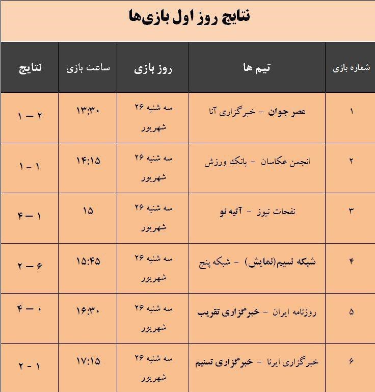 وی ادامه داد: در اولین روز مسابقات تیم های عصر جوان، خبرگزاری آنا، انجمن عکاسان مطبوعاتی، بانک ورزش، نفحات نیوز، آتیه نو ، شبکه نسیم (نمایش) ، شبکه پنج، روزنامه ایران، خبرگزاری تقریب، خبرگزاری ایرنا، خبرگزاری تسنیم با هم به رقابت پرداختند.