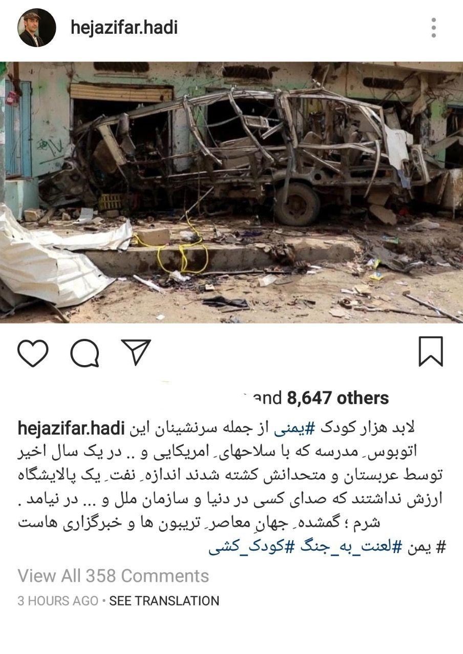 به گزارش خبرنگار فرهنگی باشگاه خبرنگاران پویا، هادی حجازیفر بازیگر سینما و تئاتر در پی حادثه عملیات تروریستی اتوبوس کودکان یمنی متنی را در صفحه شخصی خود نوشت: