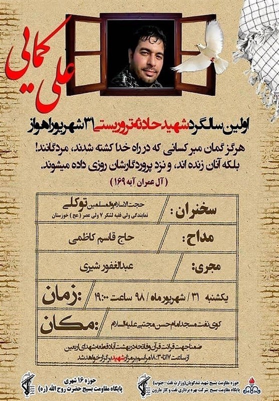 آئین بزرگداشت نخستین سالگرد شهادت بسیجی دلیر شهید علی کمایی در مسجد امام حسن مجتبی(ع) اهواز واقع در کوی نفت برگزار میشود که جمعی از دوستان و همرزمان شهید نیز در آن حضور مییابند.