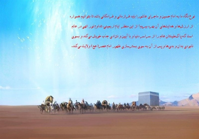 بنابراین، نوع نگاه ما به امام حسین و ماجرای عاشورا باید فرازمانی و فرامکانی باشد تا بتوانیم همواره از ارزش‌ها و هدایت‌های آن بهره ببریم؛ کسانی که از منظر «نور» به اهل‌بیت و امام‌حسین می‌نگرند، افرادی‌اند که زمینه بهره از هدایت‌های حسینی را برای خویش فراهم می‌کنند؛ برای چنین افراد مؤمنی، این روایت نبوی به‌صورت ملموس نمود دارد که فرمود: «إنَّ الحَُسین مِصباح‏ُ الهُدَى‏ و سَفینةُ النَّجاة» و این نور نه‌فقط منحصر در سال 61 هجری، بلکه نوری پیوسته جاری در تمام تاریخ گذشته و آینده است. برای چنین افرادی ایام اربعین، تداوم نور الهی در عالم است که آغاز آن به جریان عاشورا و کربلا بازمی‌گردد؛‌ نوری که پاک‌طینتان عالم را از سراسر دنیا و با هر دین و آیین و نژادی جذب خویش می‌کند و به‌سوی نابودی بدان و بدی‌ها و پس از آن به‌سوی بسترسازی ظهور امام عصر(عج) هدایت می‌کند.