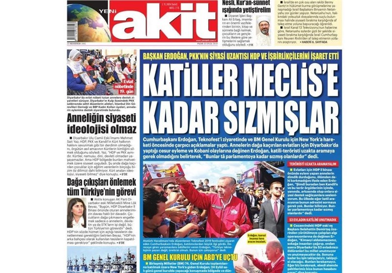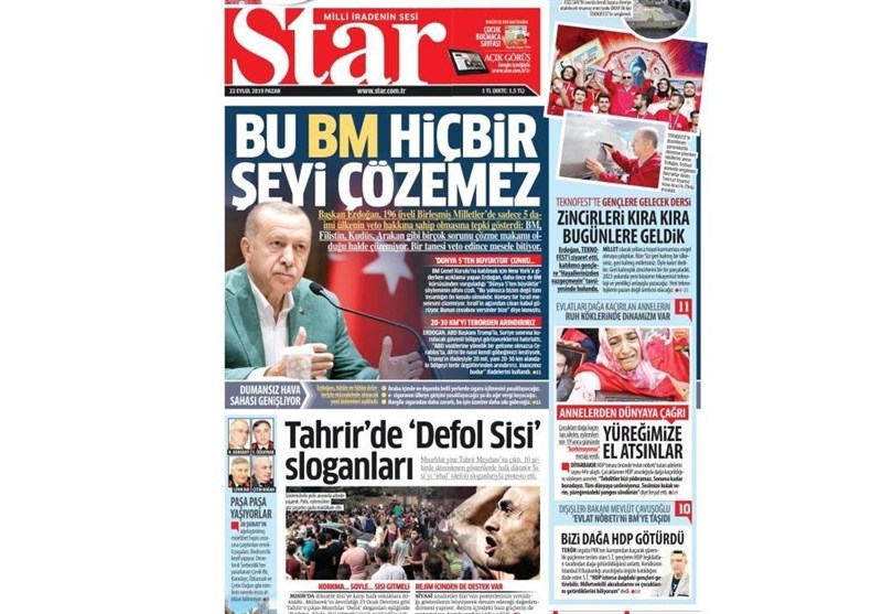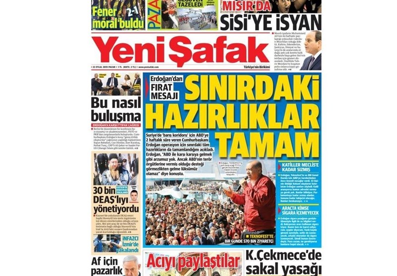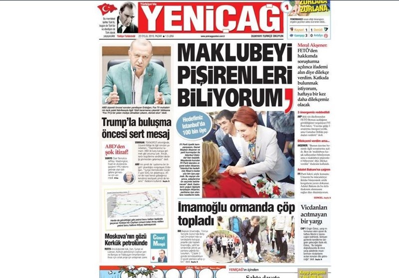 به گزارش گروه بینالملل خبرگزرای تسنیم، بسیاری از روزنامههای ترکیه، امروز در عکس و تیتر صفحه نخست، سخنان اردوغان پیش از سفر به آمریکا را برجسته کردهاند. این روزنامهها همچنین به تظاهرات مخالفین سیسی در مصر پرداختهاند.