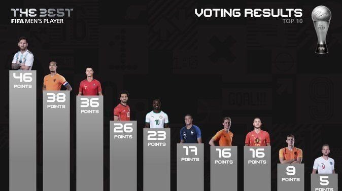 بر این اساس مسی با کسب 46 رای بالاتر از فندایک با 38 و رونالدو با 36 امتیاز در رده اول ایستاد.