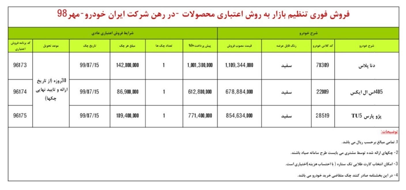 به گزارش خبرنگار اقتصادی خبرگزاری تسنیم، شرایط فروش اعتباری محصولات ایران خودرو به تعداد بسیار محدود از ساعت 11 صبح روز چهارشنبه مورخ 98/07/10 آغاز خواهد شد.
