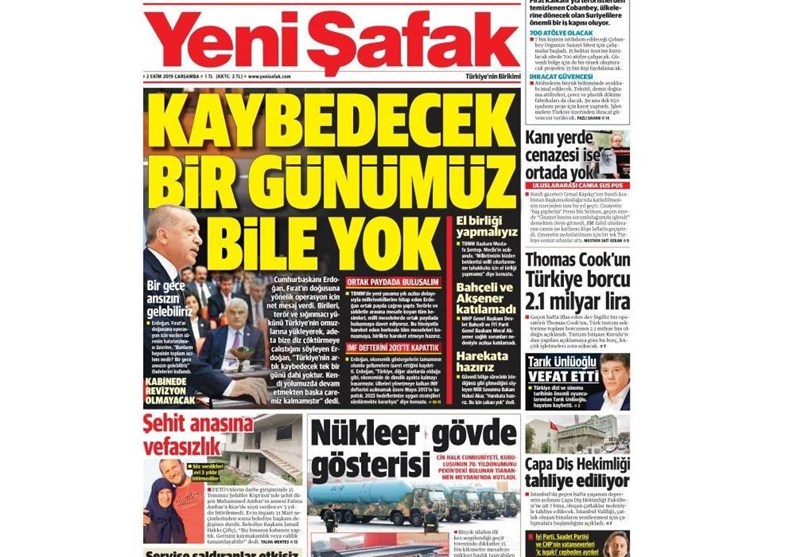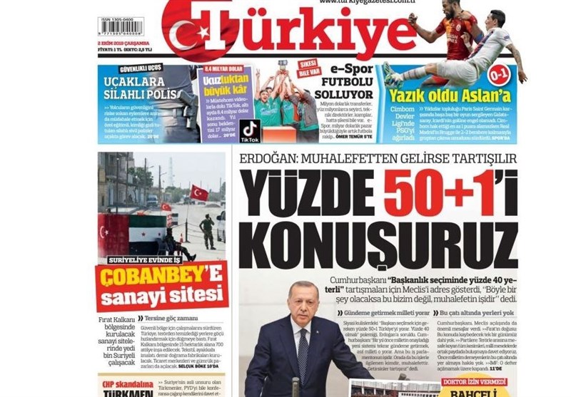 به گزارش گروه بین‌الملل خبرگزاری تسنیم، بسیاری از روزنامه‌های ترکیه، امروز در عکس و تیتر صفحه نخست، پیام اردوغان در مورد ورود به شرق فرات را برجسته کرده‌اند.