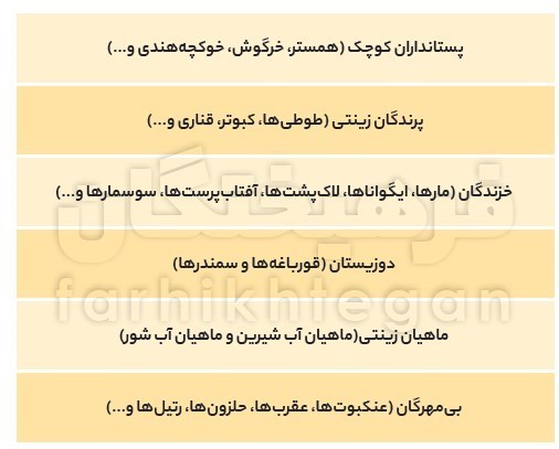 در بازار حیوانات خلیجفارس، علیرغم غیرمجاز بودن خریدو فروش و معامله، فهرستی از حیوانات که از آنها به اشتباه، با عنوان «حیوان خانگی»، «حیوان زینتی» یا «حیوان همنشین» یاد میشود، فهرستی از حیوانات نیز با عنوان «اگزوتیک پت» عرضه میشود. حیوانات اگزوتیک، گروهی از حیوانات خانگی خاص هستند که نگهداری آنها در محل زندگی با انسان، نامتعارف است. اگرچه درمحیط منزل توانایی برقرار کردن حداقل امکانات زیستی و شرایط نگهداریشان میسر است ولی مانند «حیوانات همنشین» همچون سگ و گربه از همنشینی با انسان لذت نمیبرند، حتی اگر در شرایط نگهداری مناسب در منزل، بیشتر از متوسط طول عمرشان در طبیعت زندگی کنند! این گروه از حیوانات به 6 دسته زیر تقسیم میشوند: