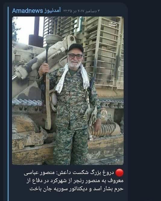 این پیام را روحالله زم در اولین ساعات شهادت پدرم در آمد نیوز منتشر کرد: «دروغ بزرگ شکست داعش: منصور عباسی معروف به منصور رنجر از شهرکرد در دفاع از حرم بشار اسد و دیکتاتور سوریه جان باخت.»