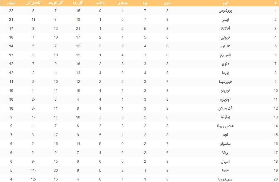جدول رده‌بندی سری A در پایان شب دوم از هفته هشتم