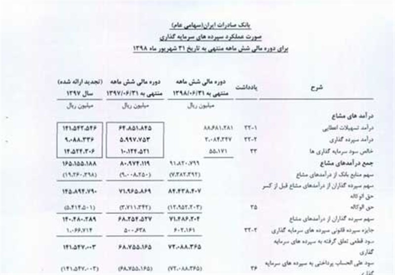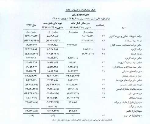 بر اساس صورتهای مالی (حسابرسینشده) منتشر شده در سامانه کدال، بانک صادرات برای دوره مالی منتهی به 31 شهریورماه 1398، به ازای هر سهم 3 ریال سود محقق کرده است. در سهماهه نخست امسال این بانک به ازای هر سهم یک ریال سود محقق کرده و از نقطه سر به سر عبور کرده بود.