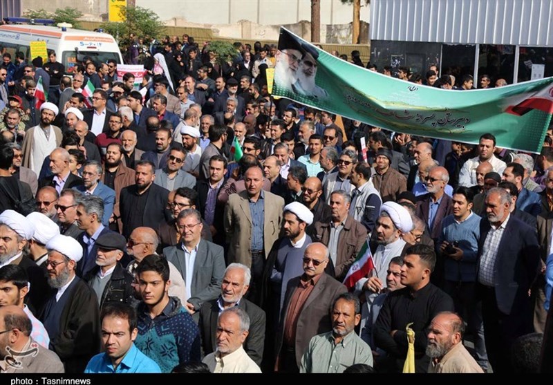 مردم بصیر که پیشاپیش آنان روحانیون و فضلای حوزه گام برمیدارند با شعارهای "مرگ بر آمریکا" و "مرگ بر اسرائیل" انزجار خود از استکبار و مستکبرین را به نمایش گذاشتند.