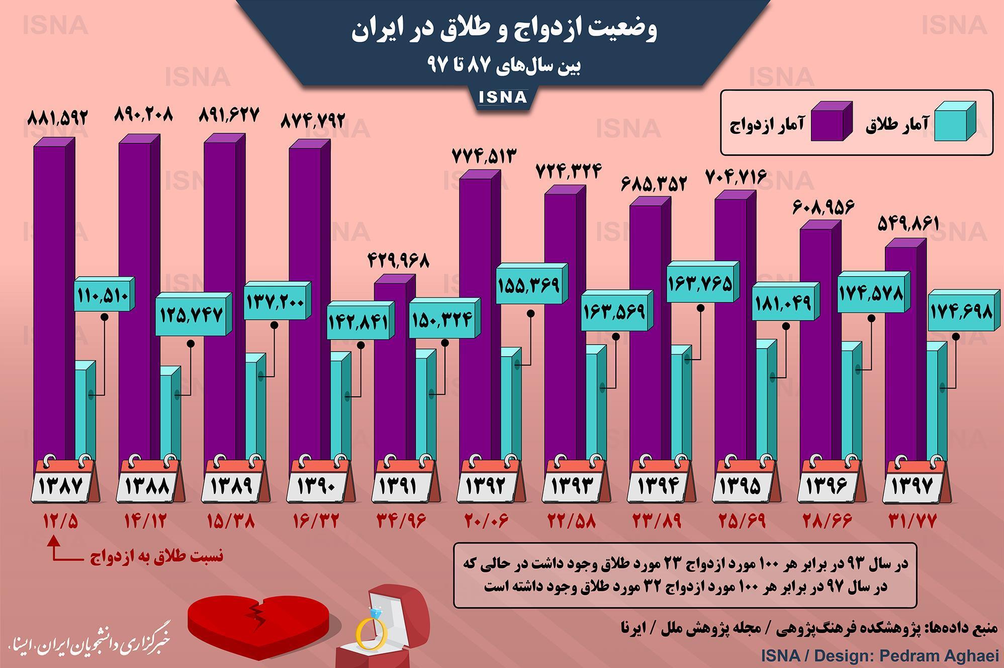 طبق آمارهای منتشرشده از سوی مشترک پژوهشکده فرهنگ‌پژوهی، مجله پژوهش ملل و بخش پژوهش ایرنا درباره وضعیت ازدواج و طلاق بین سال‌های 87 تا 97، روند طلاق در طول یک دهه اخیر در ایران رو به افزایش بوده است.