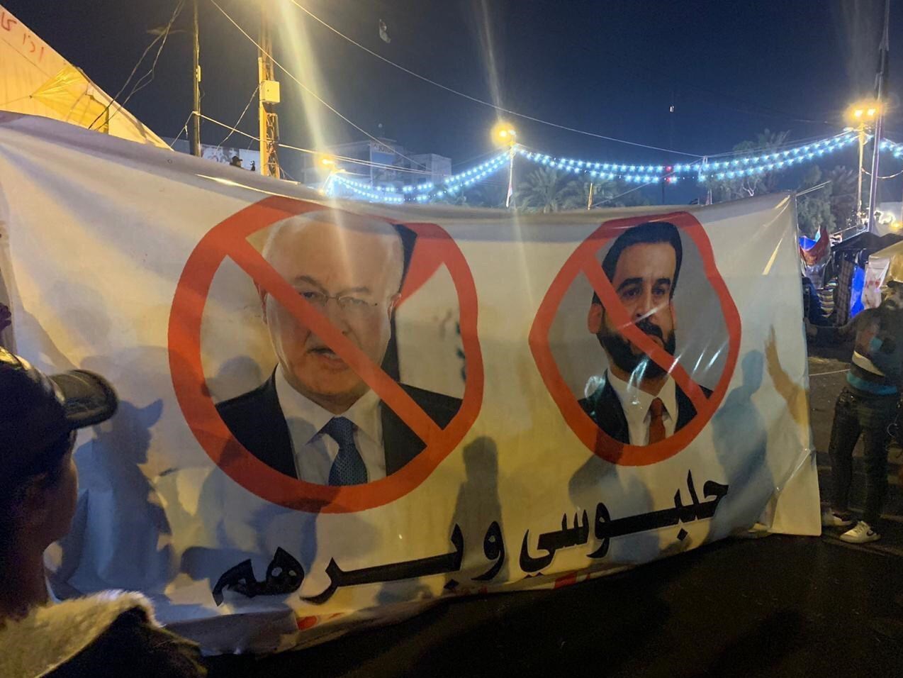 در میدان التحریر بغداد شعارها این بار ضد برهم صالح رئیس جمهور و محمد الحلبوسی رئیس مجلس تغییر جهت داد .